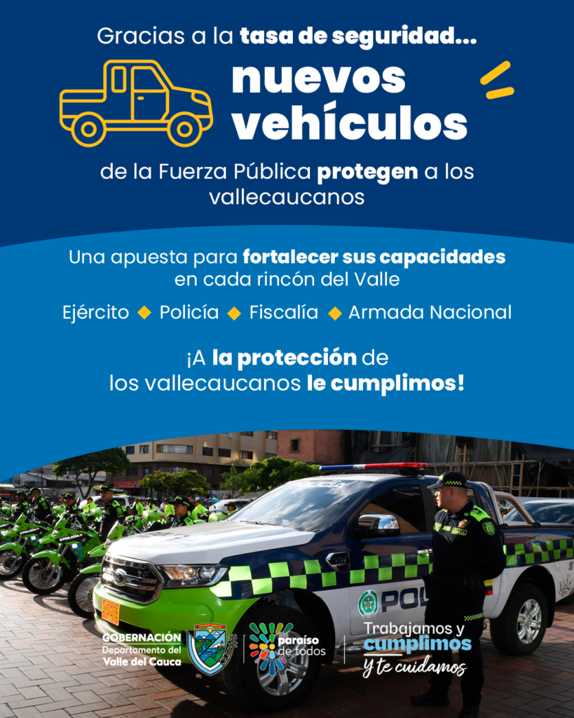 Más vehículos, más capacidad, más seguridad. Gracias a la Tasa de Seguridad, el Gobierno Departamental apoya a la Fuerza Pública en su misión de cuidar a los vallecaucanos reforzando sus capacidades. ¡Con trabajo y apoyo, la Gobernación del Valle cuida a nuestra gente!