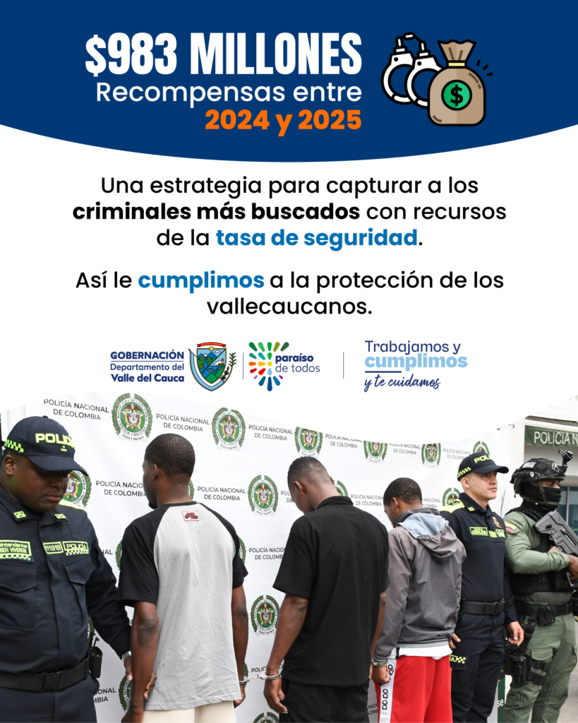 ¡Capturar a los criminales que atemorizan a los vallecaucanos es prioridad en el Gobierno Departamental! Por eso, gracias a la Tasa de Seguridad, la Gobernación del Valle ha logrado avanzar en la estrategia de recompensas y así cumplir en la tarea de cuidar y proteger al Valle.