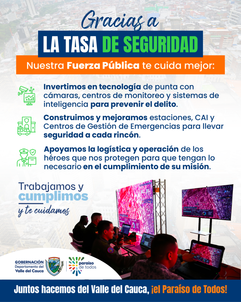 La tasa de Seguridad: clave para fortalecer la operatividad de los ‘Corredores Seguros’ en el Valle del Cauca. Y es que con los recursos de la Tasa el Gobierno Departamental ha reforzado las capacidades de la Fuerza Pública para que puedan cuidar a viajeros y vallecaucanos en las principales vías del Valle.