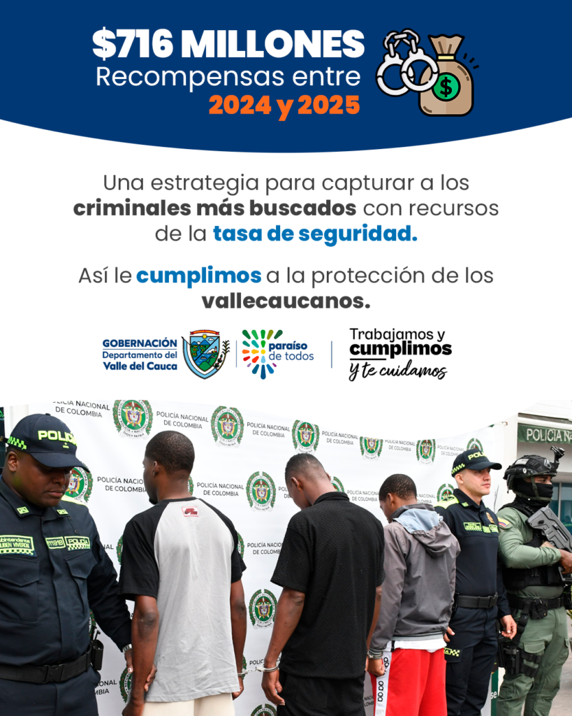 ¡Capturar a los criminales que atemorizan a los vallecaucanos es prioridad en el Gobierno Departamental!  Por eso, gracias a la Tasa de Seguridad, la Gobernación del Valle ha logrado avanzar en la estrategia de recompensas para que la ciudadanía apoye y así cumplir en la tarea de cuidar y proteger al Valle.