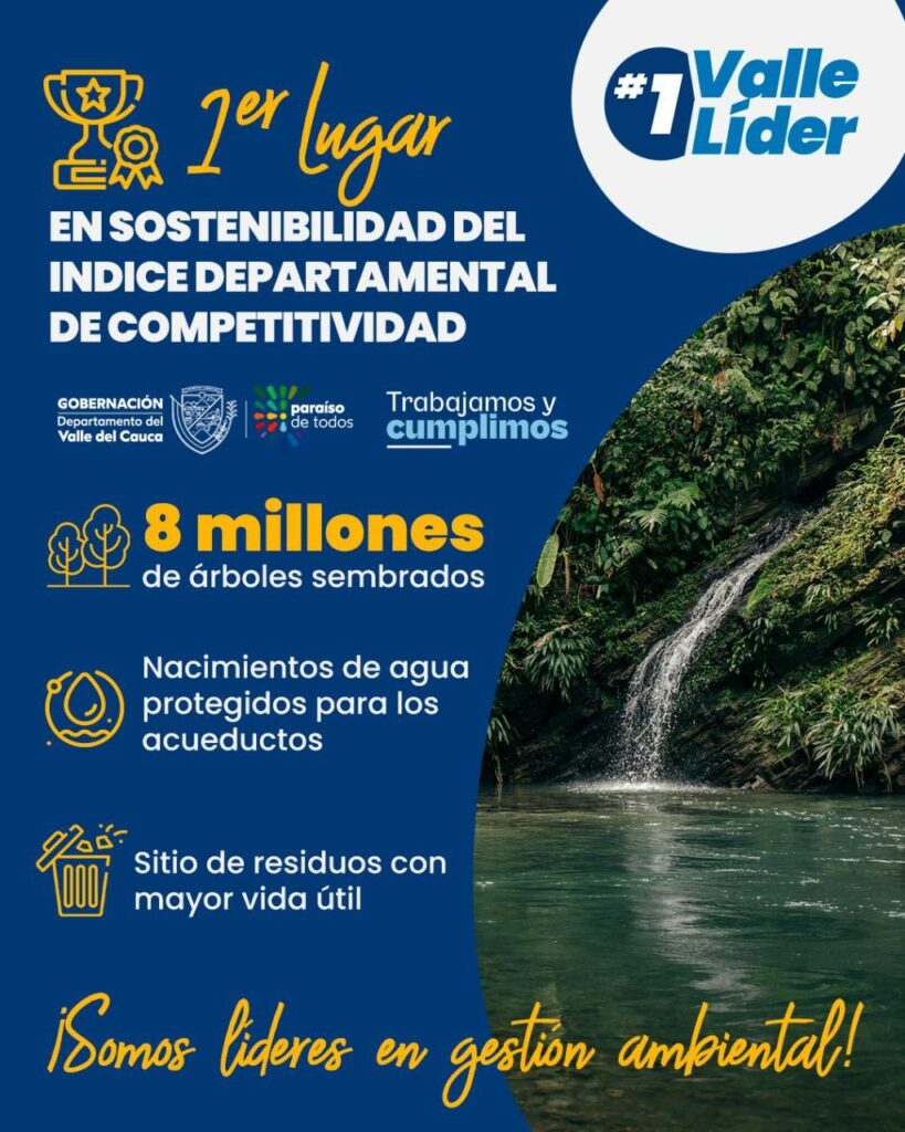 El Valle del Cauca también lidera pilares como la sostenibilidad ambiental, el desarrollo social, deportivo y la gestión pública. El departamento ocupa el primer lugar en el Índice de Desempeño Institucional y cuenta con una calificación del 97 % en el Índice de Transparencia.