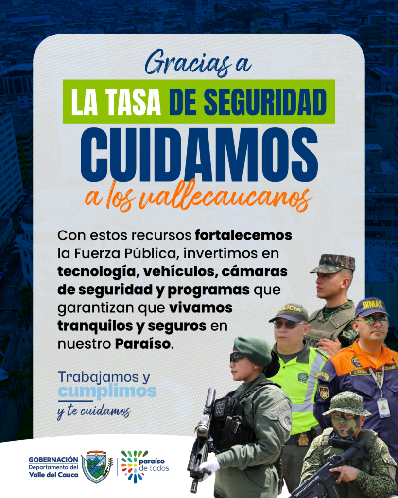 Con la Tasa de Seguridad se fortalece la capacidad de respuesta de la Fuerza Pública impulsando la innovación tecnológica, reforzando sus capacidades operativas y brindándoles herramientas para cumplir su labor diaria de cuidar a los vallecaucanos en cada rincón del territorio. Con la tasa de seguridad, la Gobernación del Valle hace frente a la criminalidad.